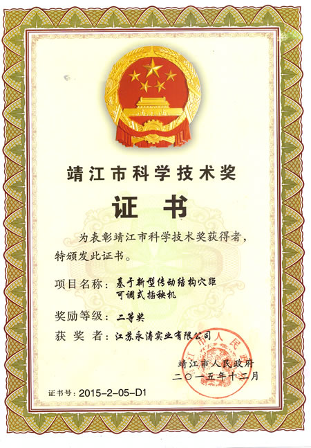 热烈恭贺江苏永涛实业有限公司荣获靖江科学技术奖